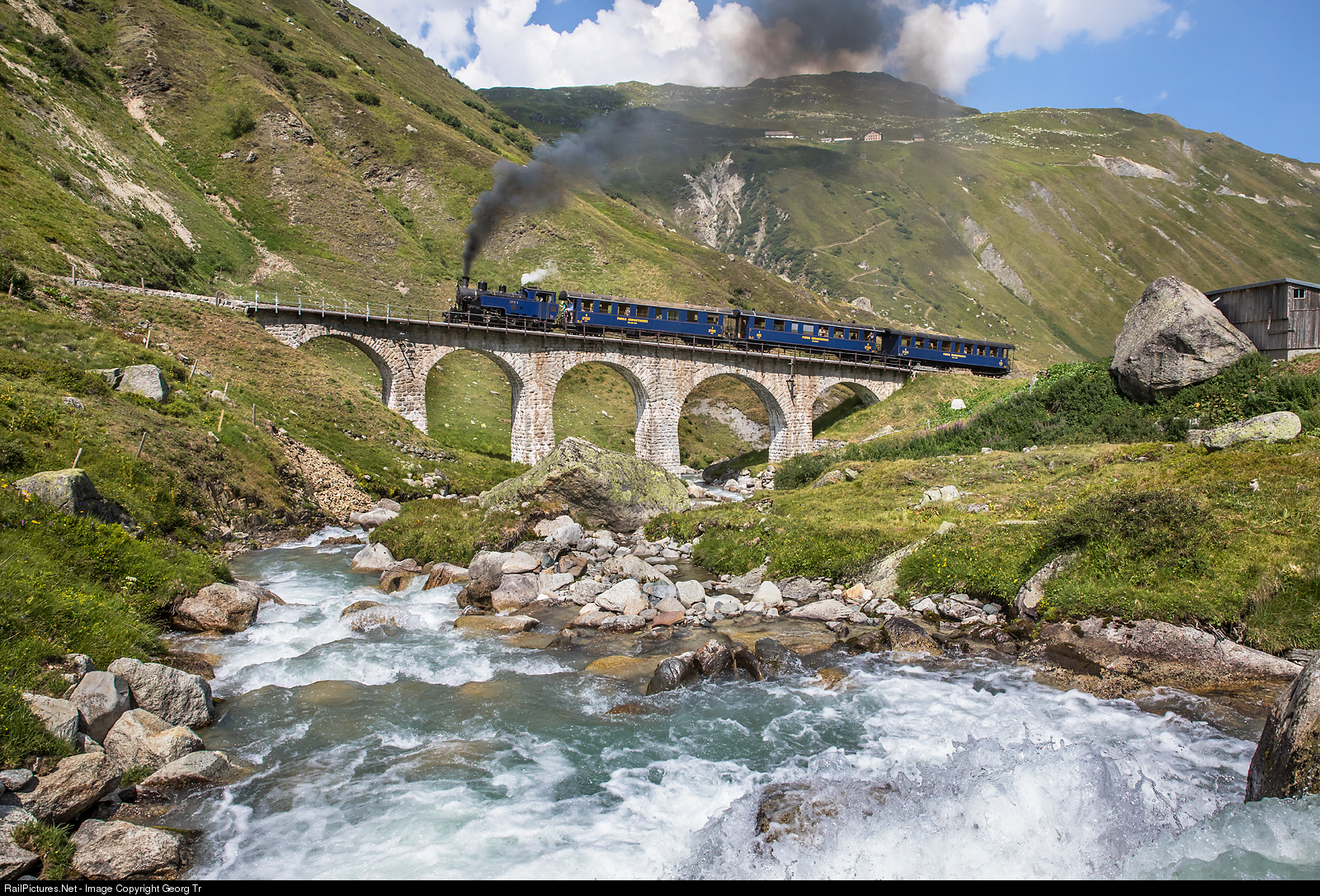 2-6-0T cogwheel steamlocomotive HG 3/4 # 1 "Furkahorn" of the Dampfbahn Furka Bergstrecke, built in 1913 by SLM for the Brig-Furka-Disentis railway (BFD), is pulling train 157 (called "the Blue train") from Realp to Gletsch over the Steinstafel viaduct between Tiefenbach and Furka, on the eastern ascent to the Furka Pass. Between Gletsch and Oberwald, the passenger have to travel with the diesel train because of high wild fire risk.