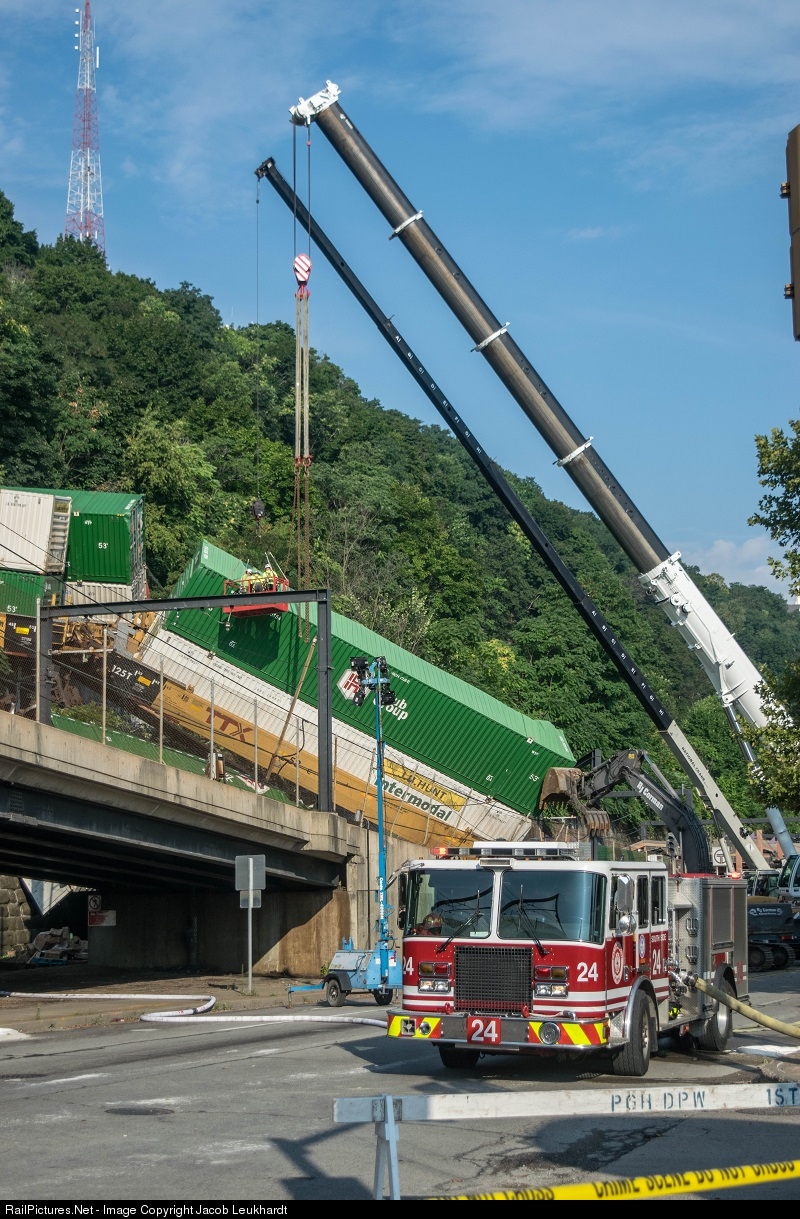 | NS 21Q wreaked havoc on Pittsburgh South Side when 7 intermodal well-car sets flew off the track. Many, landed just a few hundred feet from a crowded Transit station. NS is currently re-routing trains via the Southern Tier/Buffalo Line and over CSX through the Pittsburgh area. |