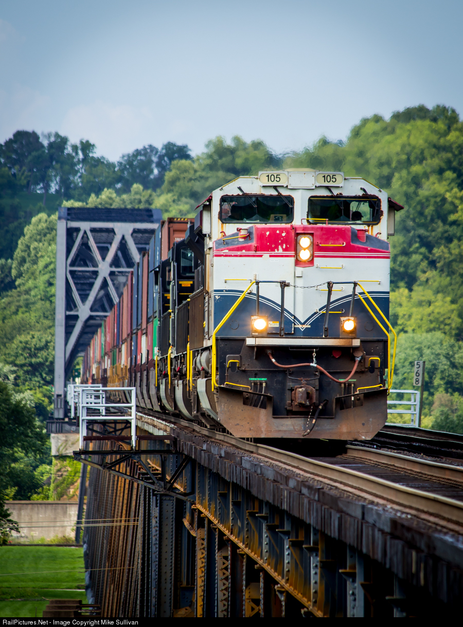 Florida East Coast SD70M-2 #105 continues it's tour of the Norfolk Southern system on lease as it leads Chicago to Norfolk stack train 234 across the Ohio River into West Virginia. The 105 is certainly worse for wear, and is definitely due for a fresh coat of paint.
