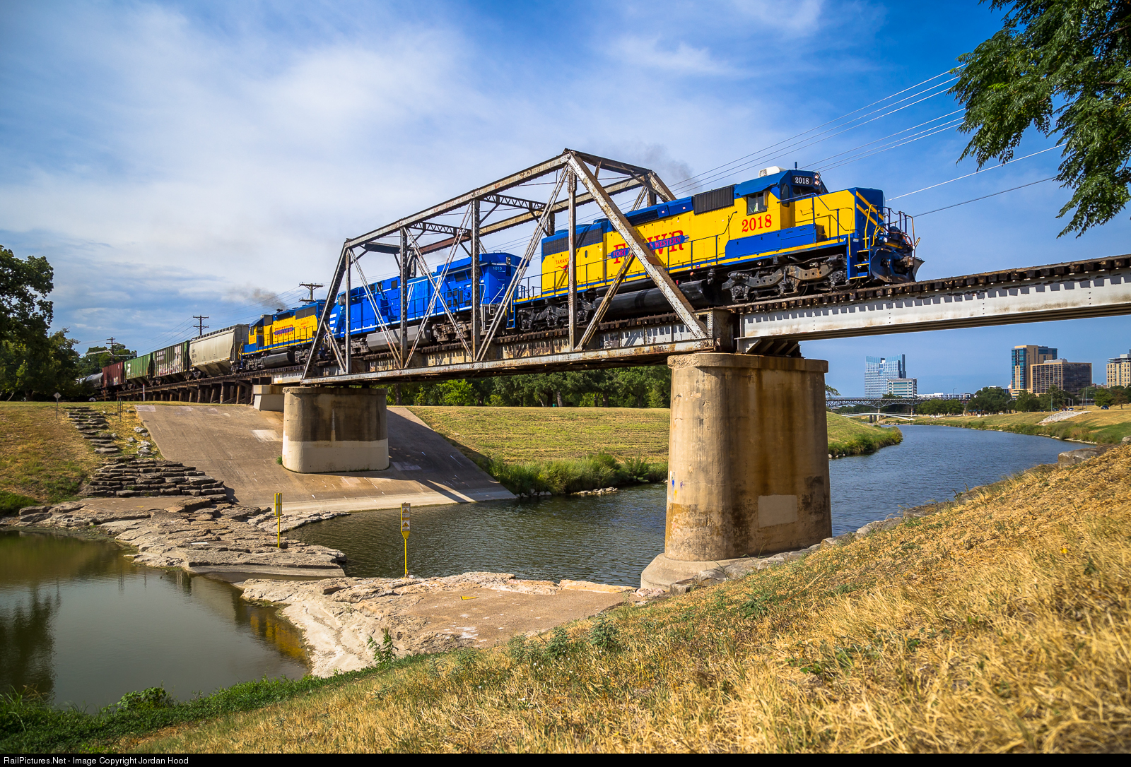 | Overcast morning skies gave way to afternoon blue skies, just as Fort Worth and Western's Cresson Turn began their southbound trek. The locomotives notch up as they cross the Clear Fork Trinity River to accelerate out of Cowtown. |