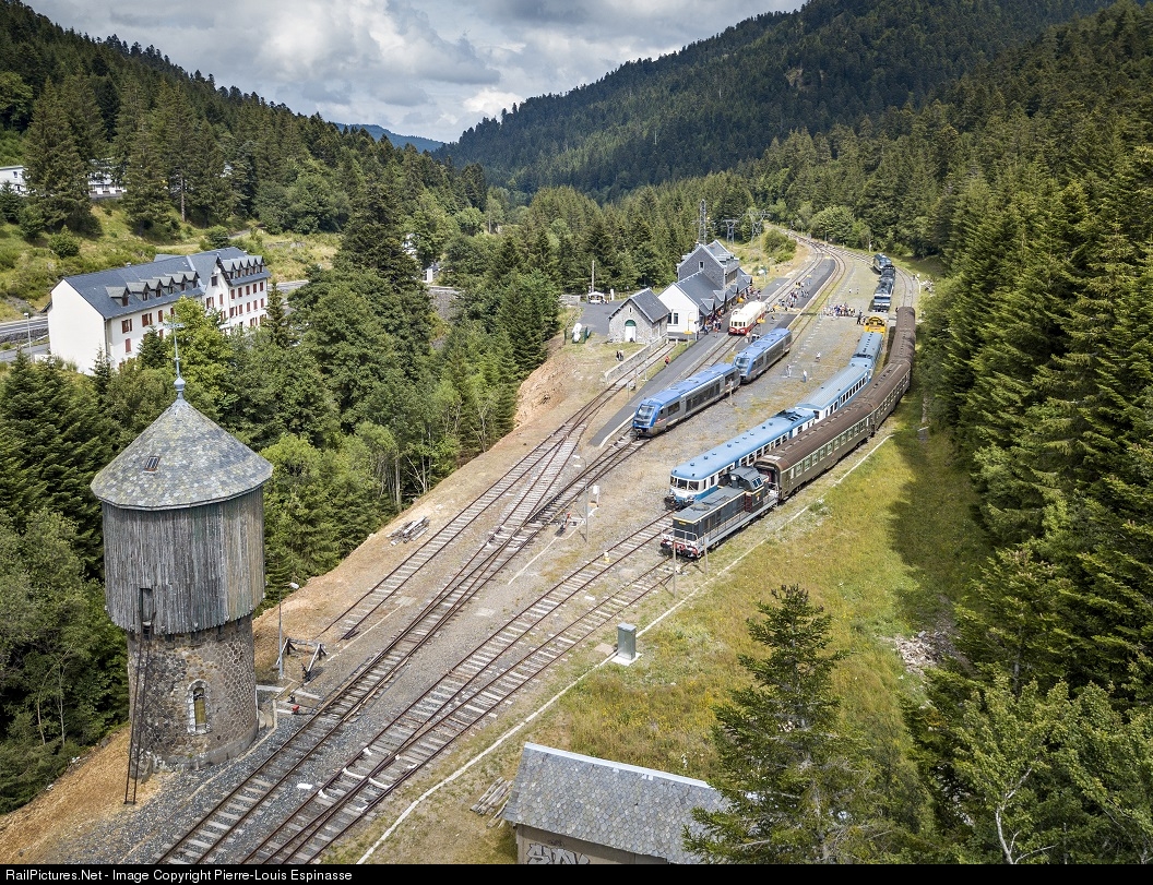 For celebrating the 150th birthday of the “Le Lioran line” many charter railcars were organized coming from Toulouse, Langogne, Limoges, Saint-Flour and Aurillac. On the foreground, the preserved water tower, a historic landmark of the Le Lioran line.