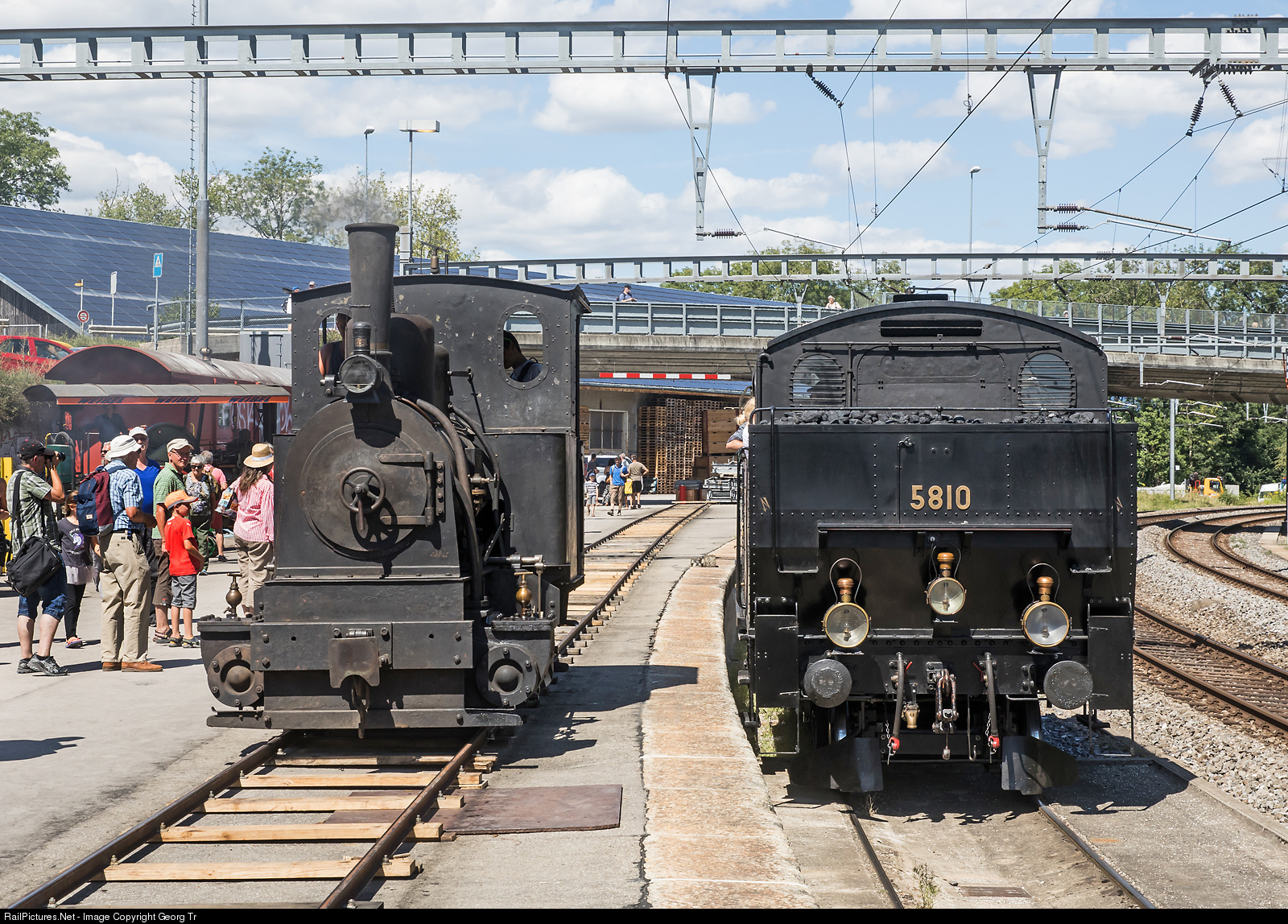 On the occasion of the Lyss steam days, meeting of two very different steam locomotives: On the left 0-4-0 work train locomotive "Ticino", privately owned, running on a provisionally laid, about 150 meter long 1 meter gauge track on the loading ramp of Lyss. On the right "Habersack" 2-6-2 T locomotive Eb 3/5 # 5810 of Dampfbahn Bern (Steam Railway Bern, DBB), running on the standard gauge, which is about one meter lower. Both are visitors of the Lysser Dampftage, which suffered from the drought and took place with a reduced programme.