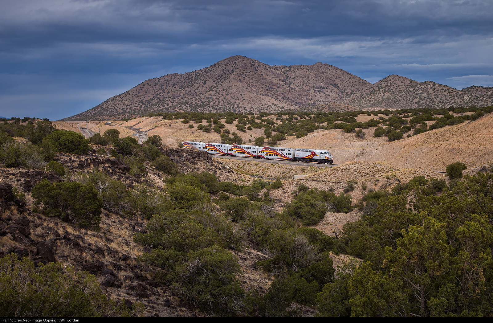 A New Mexico Rail Runner races across the New Mexico landscape south of Santa Fe bound for Albuquerque while ominous dark clouds provide a backdrop on a gorgeous July afternoon.