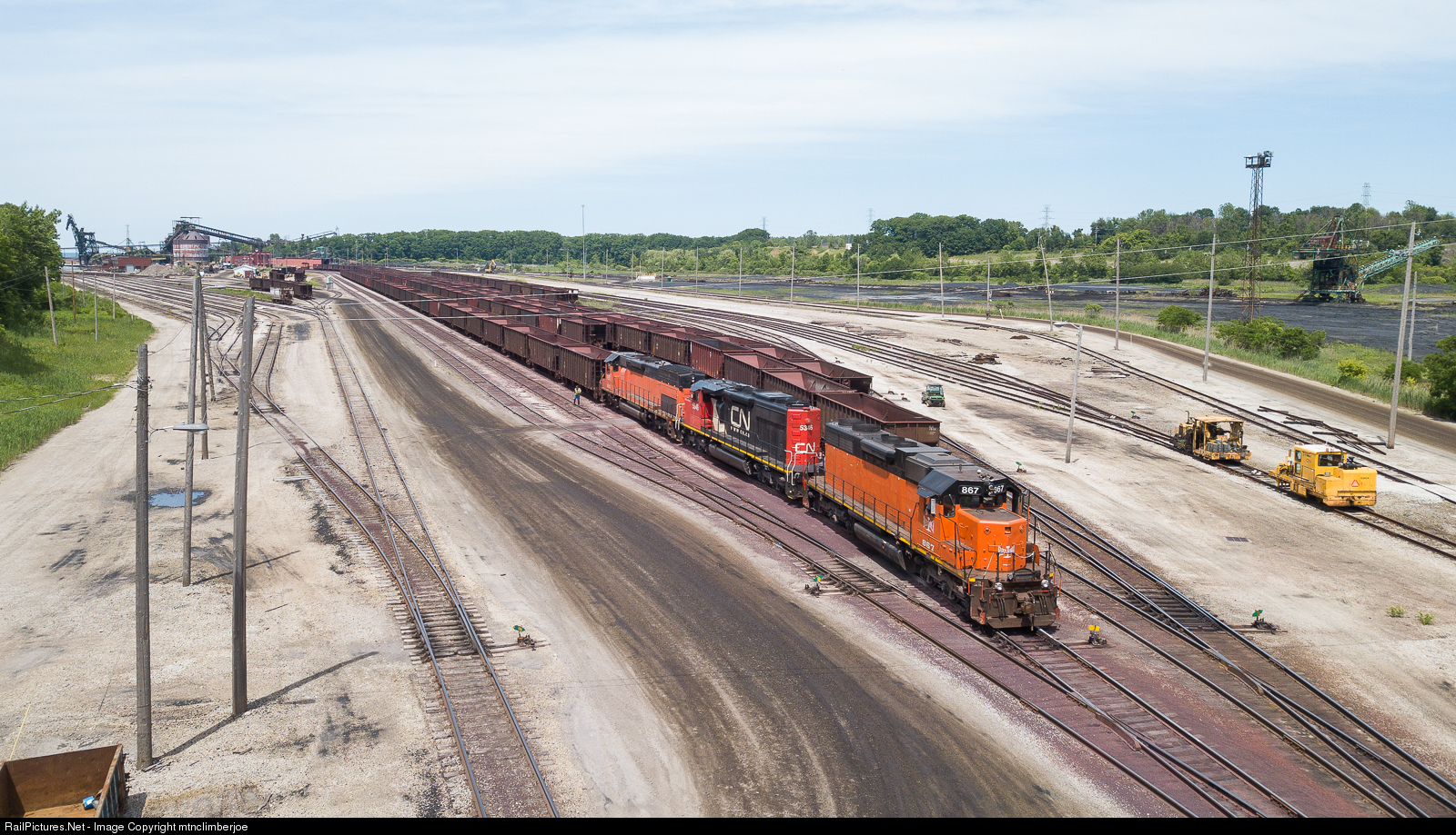 Bessemer & Lake Erie SD38AC 867 is on the point as the crew backs the power set on to loaded iron ore cars and builds the southbound train in the Conneaut Harbor.