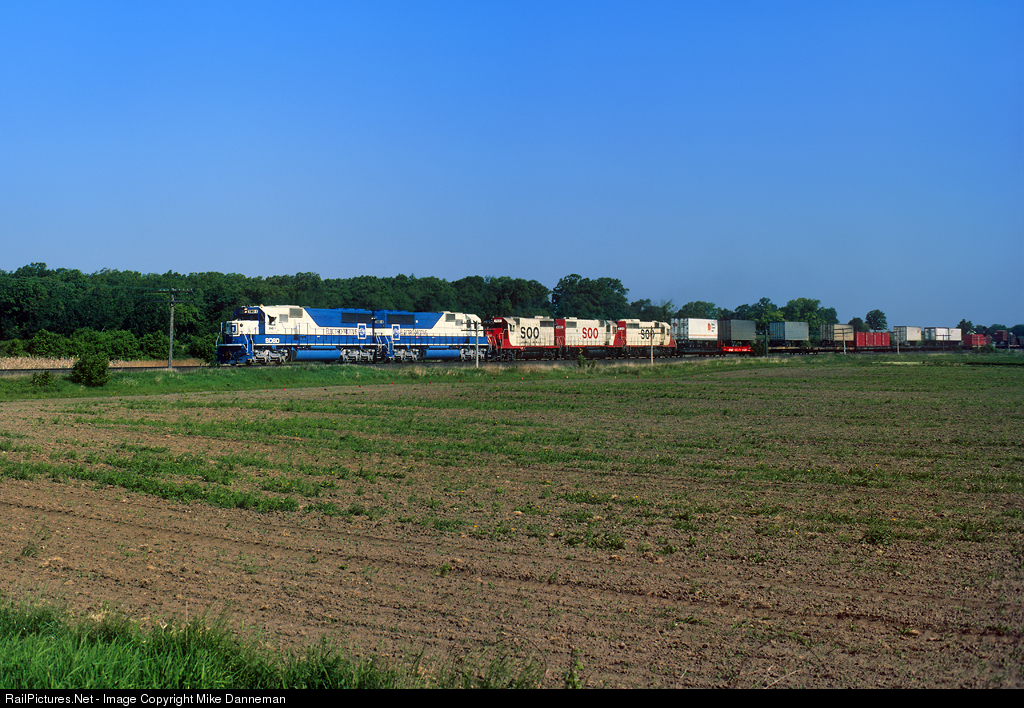 On May 25, 1985, Soo Line tested Electro-Motive Division’s brand new SD60 demonstrators on a train south out of Shops yard at North Fond du Lac, Wisconsin. A train of 111 loads and four empties weighing in at 12,743 tons climbed Byron Hill without the assistance of the normal helper, powered by EMD 1 and EMD 4, along with Soo GP35 No. 727, GP38-2 No. 4401 and GP40 No. 734. They made it over the hill, and in this view are departing Byron, picking up a little speed with the Chicago-bound train. Soo Line was apparently impressed enough with the new locomotives to purchase them, with Nos. 6000 to 6062 arriving on the property between 1987 and 1989, with the last five being Soo’s only SD60M models.