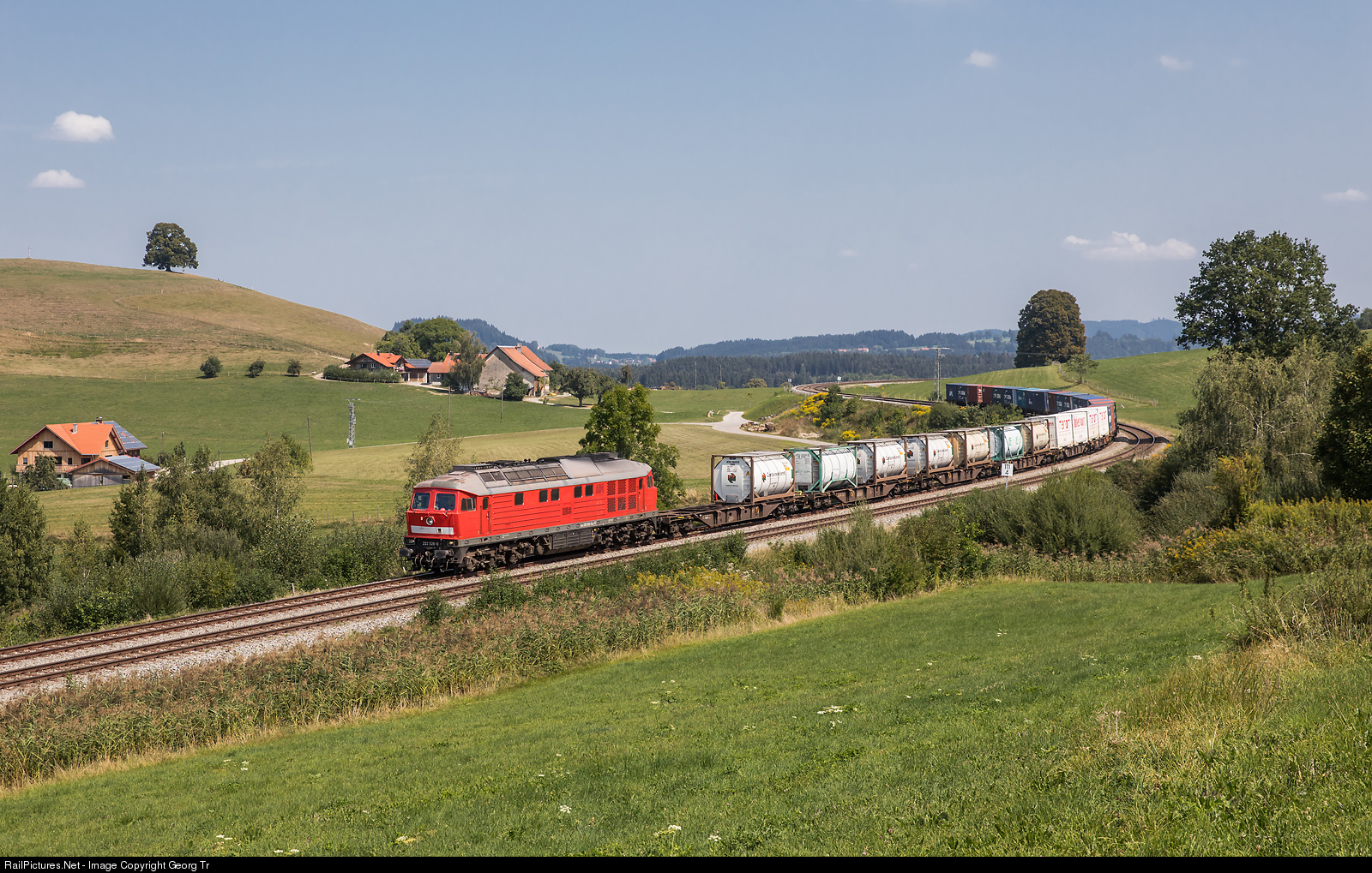 During a planned interruption of the Arlberg railway line in Austria, freight trains are diverted via the Allgäu line through Germany. Near Heimhofen, between Oberstaufen and Lindau, diesellocomotive 232 # 528 of the DB Cargo is pulling the westbound container train EZ 45190. The 232 series, called "Ludmilla", were built by Woroschilowgrad/USSR for the Deutsche Reichsbahn of the German Democratic Republic as V 132 from 1970 to 1982 and has about 4000 HP.