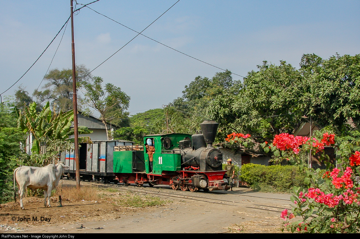 | Asembagus Sugar Mill ran trains hauling not only unprocessed sugar cane, but also boxcar trains containing finished sugar in 50kg bags. Here is one such train, hauled by No. 11 along track that had certainly seen better days; derailments were common but soon fixed as there was no shortage of manpower to coax a derailed car or loco back onto the rails. |