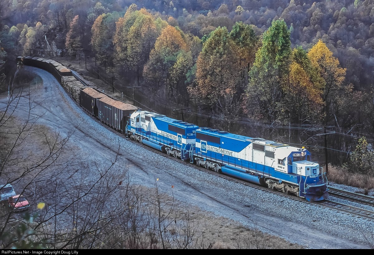 Talk about the Baltimore & Ohio in West Virginia will often center around coal traffic, but there was also a good deal of products carried for the pulp and paper industry. Here two SD60 demonstrators pull a trainload of wood chips and pulpwood east through Austen, West Virginia.