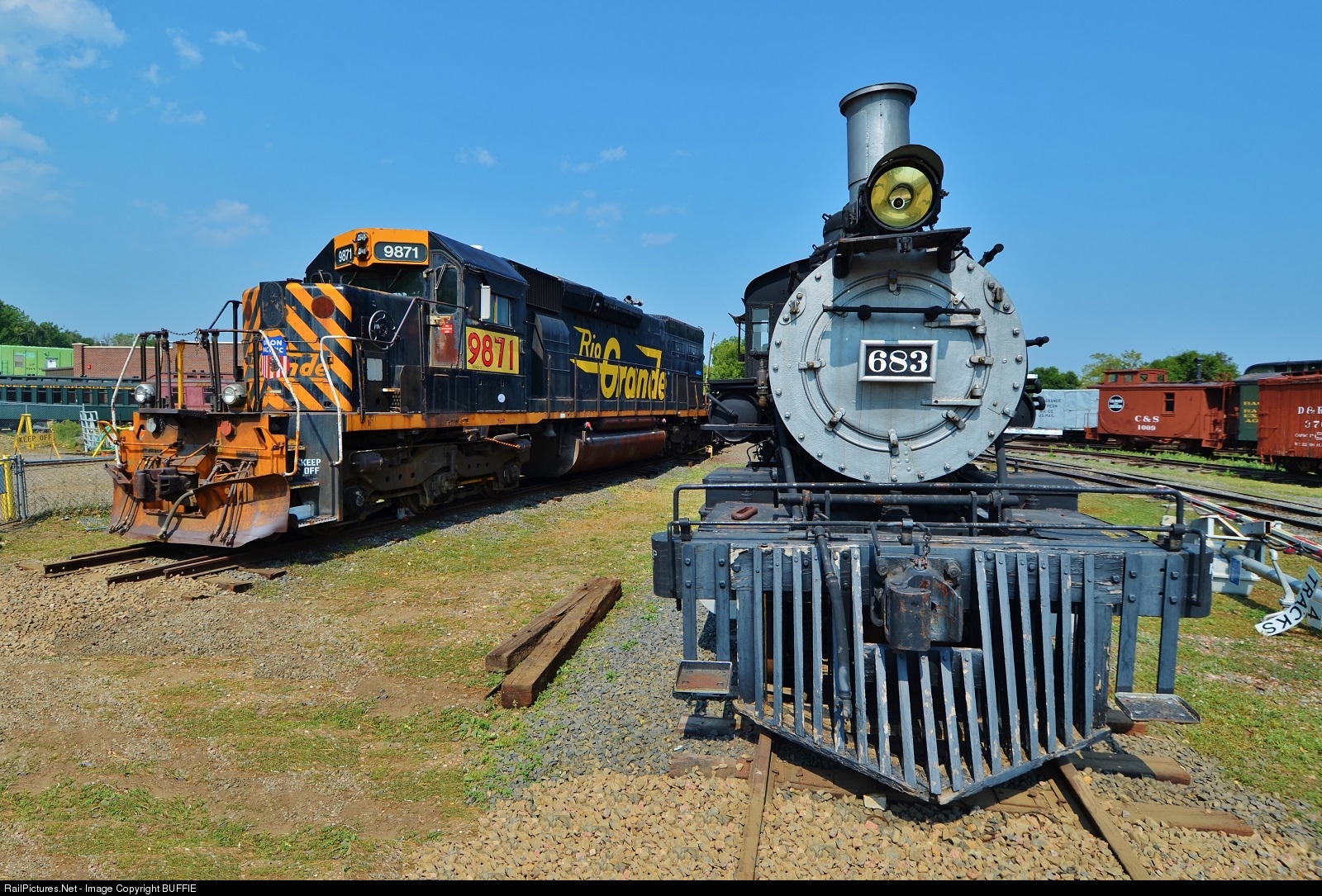 | Former DRGW tunnel motor 5401, last patched by the Union Pacific and numbered 9871 is one of the last surviving DRGW flagged SD40T-2's. There were 73 originally purchased and in their heyday could be found running through the now defunct Tennessee Pass. 9871 sits next to DRGW 683, the only surviving Denver & Rio Grande Western standard gauge steam engine. |