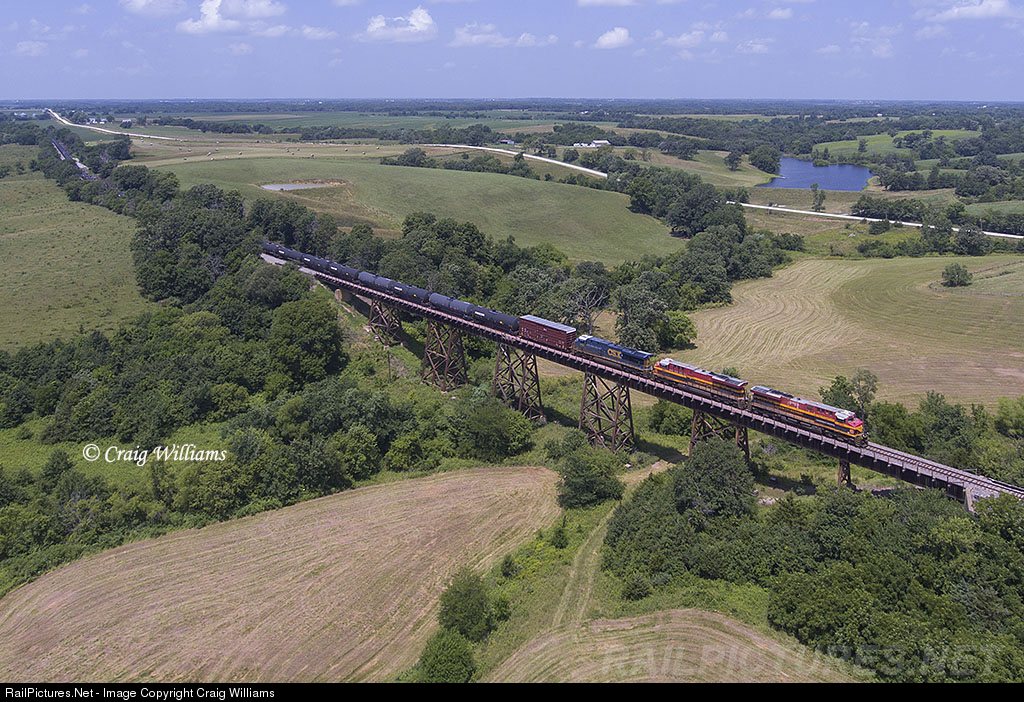 | A visit to my in-laws on my days off gave me some short time to get out and get some CP action in southern Iowa. My one catch on July 4th was this empty oil train near Foster. The CP's Laredo Sub crosses 3 bridges in southern Iowa. The far east one is not shot as much cause it is hard to access to the southside, but the other 2 bridges are near a road crossing on a gravel road. A northbound empty oil train rolls towards Ottumwa as they cross the east bridge. The train is about 5 miles west of Blakesburg as they travel northbound between KC and Ottumwa. |