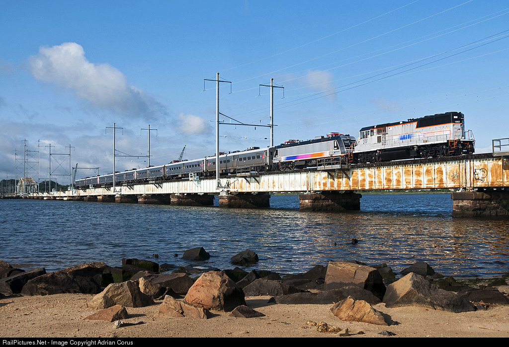 | The crew of MM-90 was sent down to RARE interlocking in South Amboy to rescue a set of Arrow IIIs that broke down earlier this morning and bring them back to the MMC. The train is seen here crossing the Raritan River Drawbridge on its way east. |
