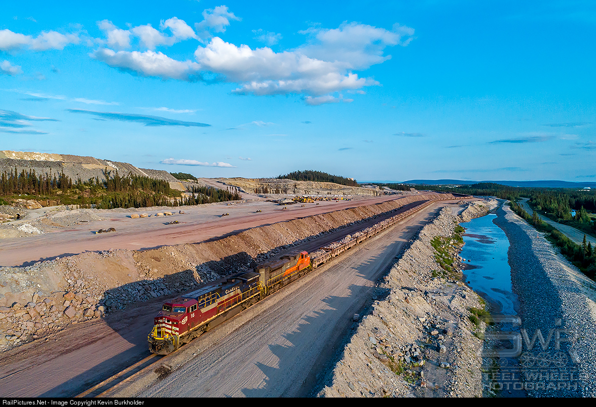 | The ArcelorMittal Fire Lake 'Fire 1' train is loaded and departing the Fire Lake Mine in the namesake location of northern Quebec. The raw ore is dumped along the train and loaded with large front-end loaders (will post a pic of that operation later) and then taken via side dump cars to the processor at Mont-Wright, Quebec. The train, led by QCM AC44CW 16 and AMMC SD70ACe 9002, will get a signal off the spur and join the Northern Subdivision for the trip to the processor. |