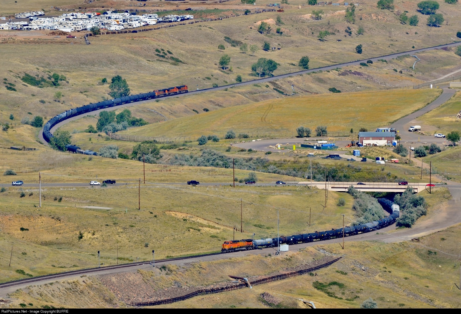 | DPU BNSF 5636 (AC4400CW) shoves a freight through the 'S' curve as it heads towards Arvada, Colorado. |