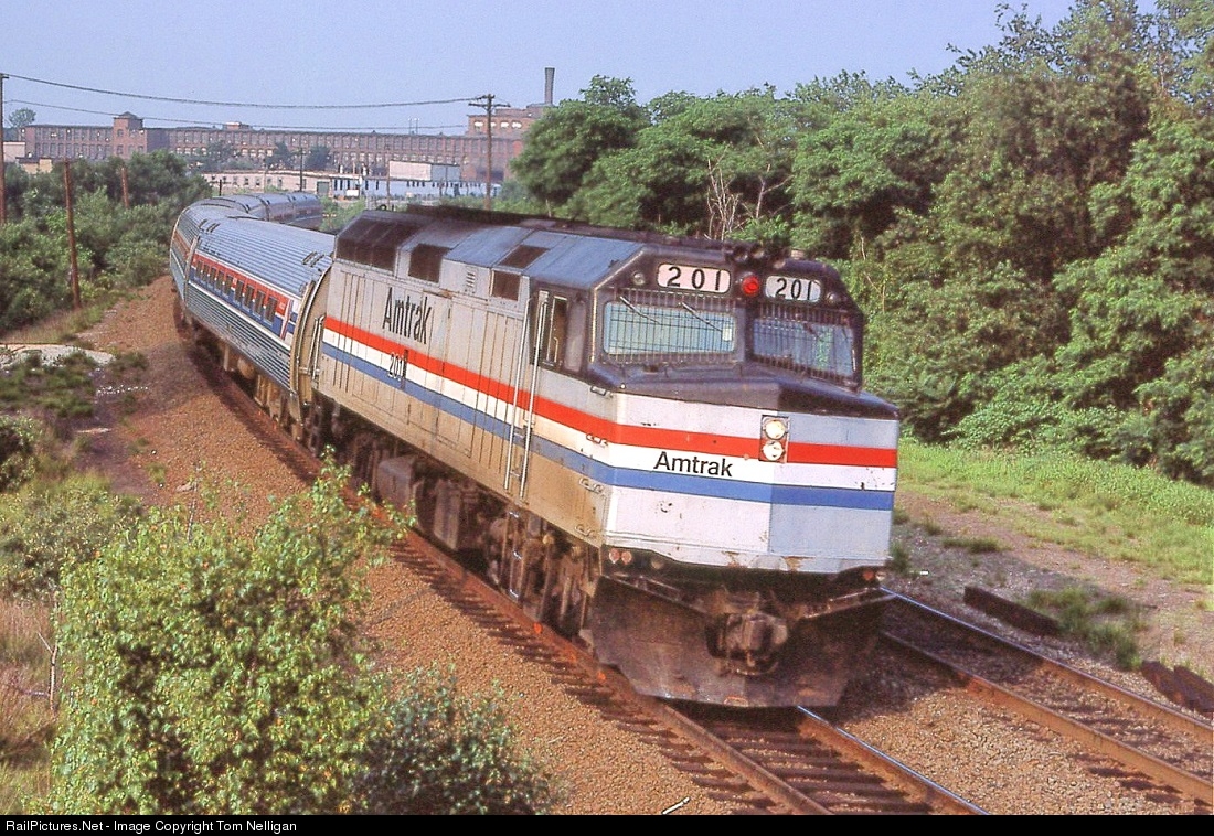 Having just crossed from Massachusetts into Rhode Island, a southbound Amtrak corridor train bound from Boston to Washington cants through the big curve at Central Falls, RI, behind F40PH 201 from Amtrak's first order of those once-ubiquitous locomotives.