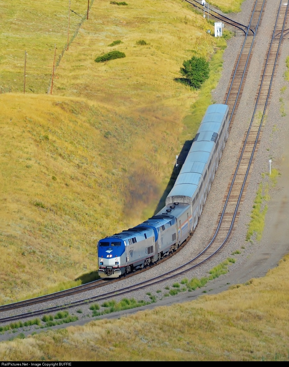 | Looking more like a roller coaster ride than an Amtrak train, the California Zephyr reaches the bottom of the hill west of Arvada and will soon enter Big Ten Curve to begin the climb up to the Rocky Mountains and the Moffat Tunnel. |