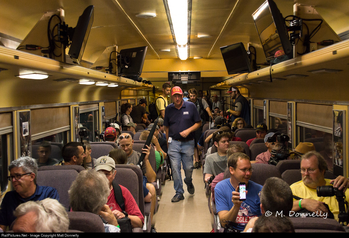 | The NCTM staff did a great job with this past weekend's night photo shoot. The photographers were treated to a ride behind the 611 as the train was used to shuttle us around the facility to various vantage points. NCTM employee Marcus is seen walking through the coach keeping us informed of the plans. |