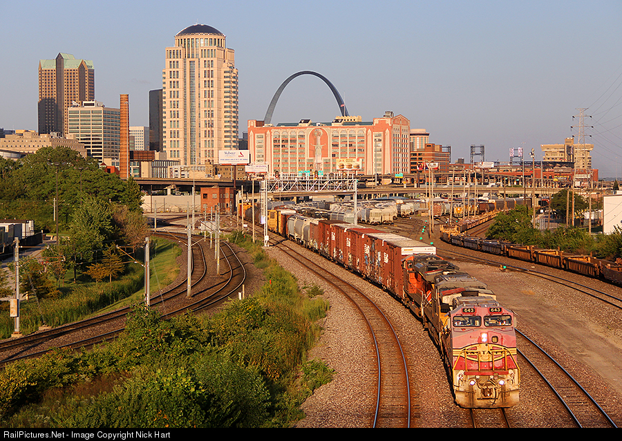| The Gateway Arch and the St. Louis skyline provide the backdrop as a veteran Santa Fe Warbonnet approaches Jefferson Avenue. Busch Stadium can also be seen in the background. As a diehard Cubbies fan, I was definitely in enemy territory. |