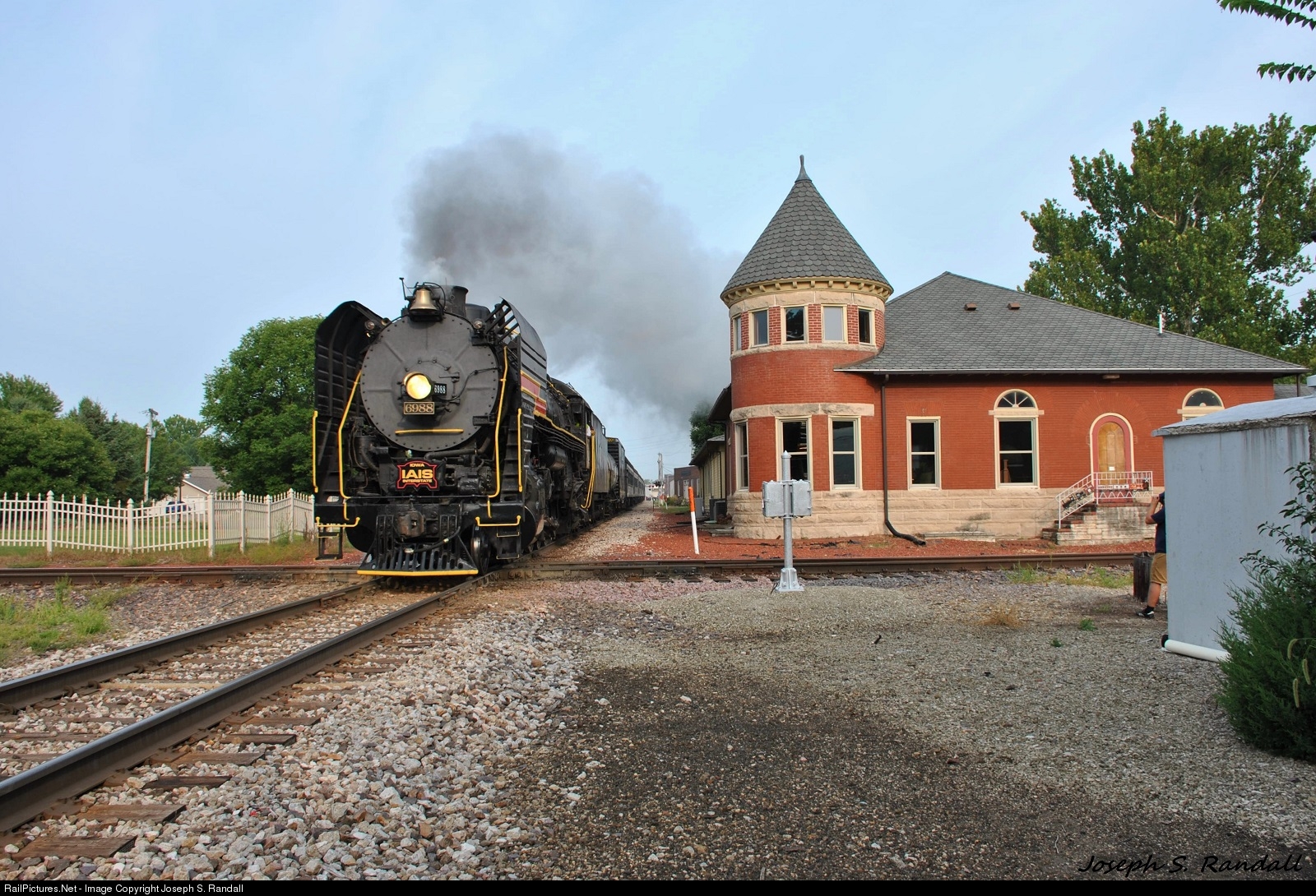 With Henry Posner III at the throttle, Iowa Interstate 6988 leads the deadhead of the benefit train past the former Rock Island/Minneapolis & St. Louis depot as they cross the diamond with Union Pacific's Eddyville Branch, making their way for Brooklyn, Iowa.