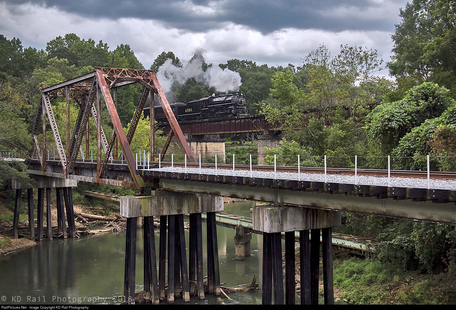 As the summer rain eases, the 117 year old Mikado SR 4501 leads TVRM 100 Missionary Ridge Local across the South Chickamauge Creek on heading the 2:30 Schedule train west for East Chattanooga. The Truss bridge in the foreground is the CSX Tyner Branch which is part of the Western & Atlantic Sub. The Tyner Branch which service most of the industries in the Bonny Oak Industrial park, and also run to the former Volunteer Ammunition grounds which is now Enterprise South Industrial Park. SR 4501 is the second steam locomotive that is taken part in the Tennessee Valley Railroad Museum 8th Annual Railfest. Once the train has turn around and make the short trek back to Grand Jct. SR 630 which is watching at the display will cone out on the main, and couple up to the bottom of the train while SR 4501 will uncouple, and turn around and get set up at the display Yard when the 4pm local returns.