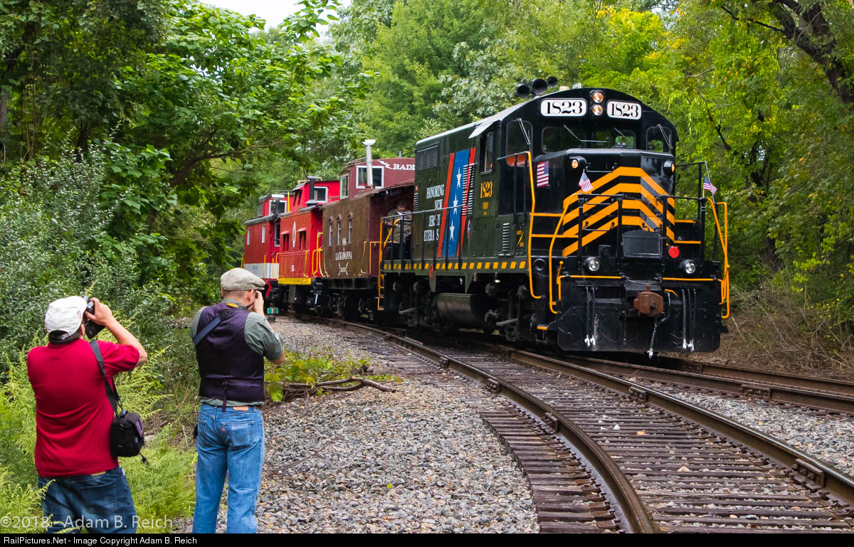 Tri-State Chester Branch Photo Stop: Tri-State Railway Historical Society members take photos of a special excursion train operating on the Chester Branch in Roxbury, NJ. The train featured the unique Dover & Rockaway River Railroad GP10 #1823, which pays tribute to New Jersey Veterans. It had been unveiled earlier in the day by the Dover & Rockaway River Railroad and the Military Transport Association. This branch had not seen a public passenger train since 1933.