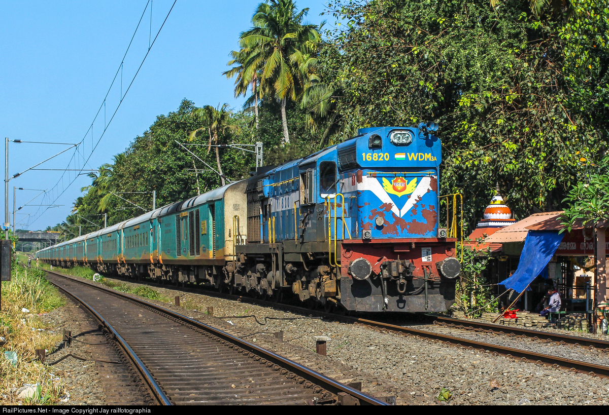 VATVA shed WDM-3A, with a bad paint job, powering Tiruneliveli bound Humsafar Express, entering Thiruvananthapuram city