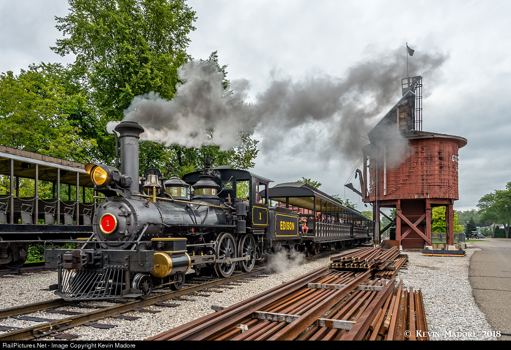 Tanking at Smith's Creek. About every 4th trip around the Greenfield Village, the park's shuttle train needs to stop for water. Just a couple of hundred feet west of the Smith's Creek Station, the railroad has built a large wooden water tank, and adjacent coal tipple, both of which are fully functional. In this image, Locomotive #1 "Edison" is seen pulling away from the water tank, after topping up the cistern in her tender. Although there are multiple water stops during a typical operating day, the locomotive generally only needs to take on coal once, which happens every afternoon at about 2:45 PM, or thereabouts.