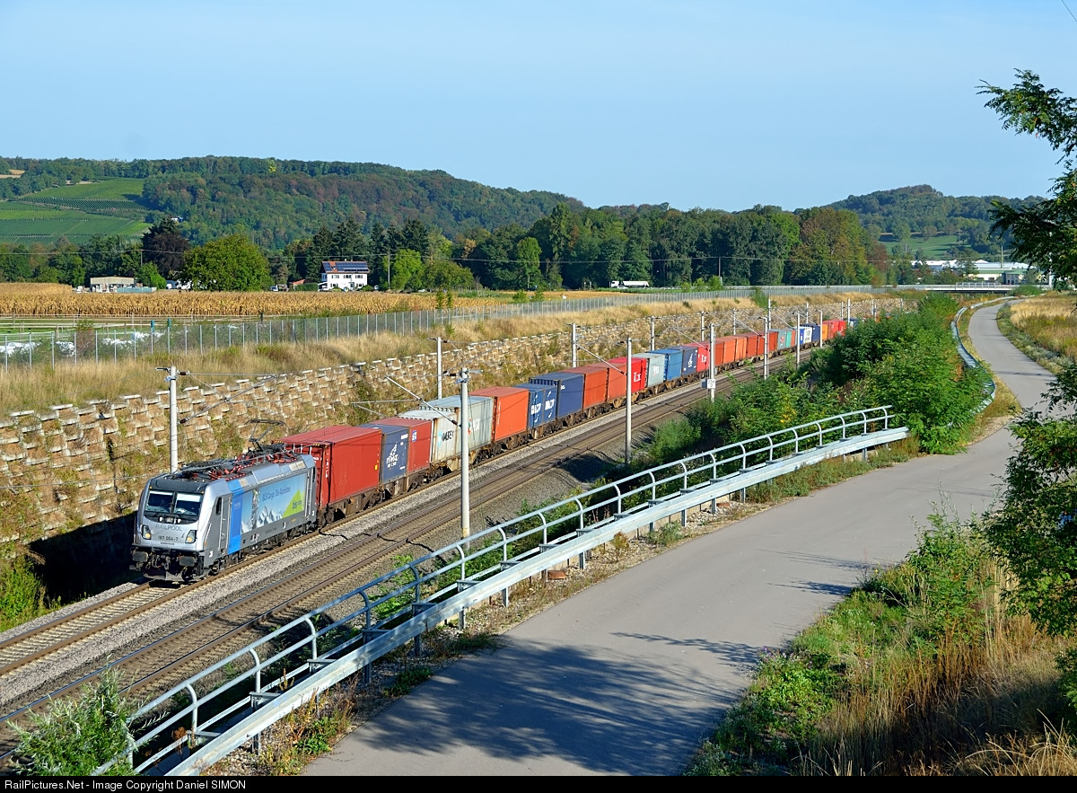 | For the new electric locomotive class 187 Bombardier used its experience with American ALP-45DP locos. The 187 develops 5600 kW in all electric mode and reaches a maximum speed of 140 km/h. A 180 kW diesel motor enables the loco to pull a train upon non-electrified tracks with 50 km/h. The first samples of class 187 were bought by the Railpool leasing company. Those locos were leased to the Swiss BLS Cargo railway. 187 004 is seen here heading south with a colorful intermodal train. |