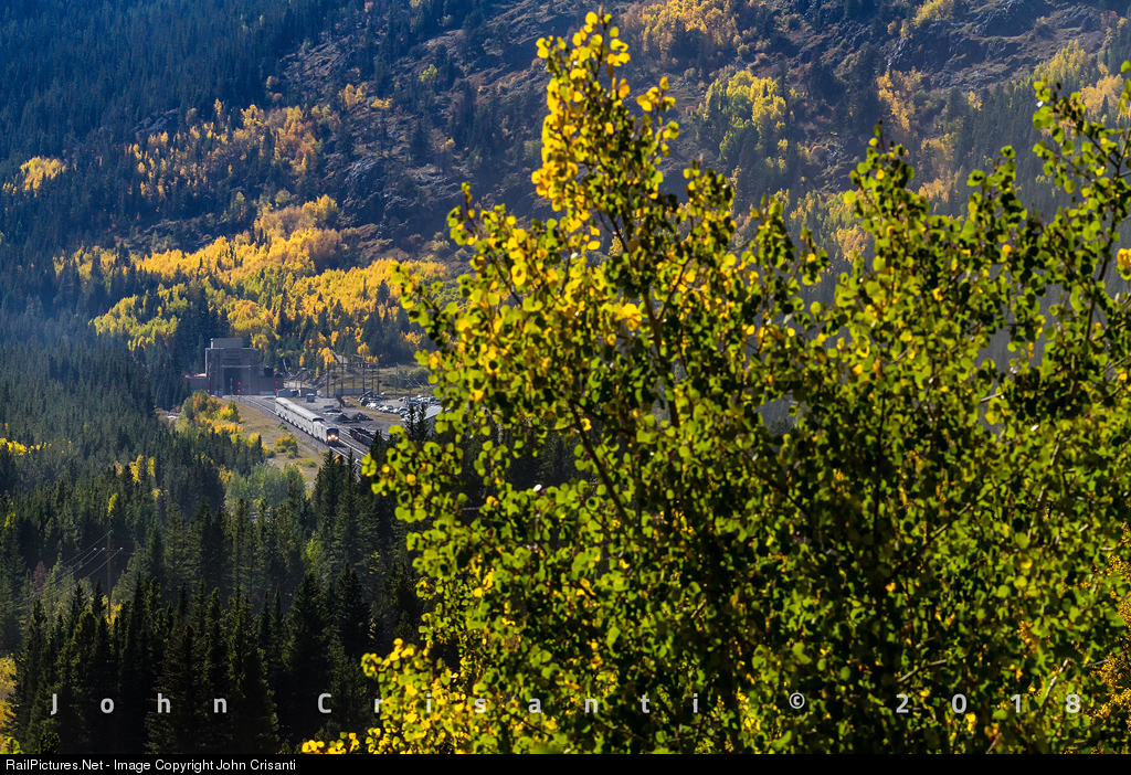 The Aspen trees show off their color as Amtrak's eastbound "California Zephyr" has just exited the Moffat Tunnel and begins its downhill descent towards Denver at East Portal, Colorado, September 15, 2018.