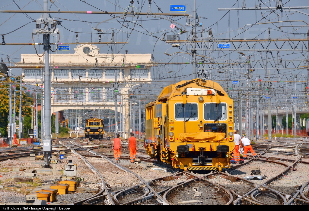 | A PLASSER & THEURER tamping machine is temporarily stopped in the work of adjusting the position of the tracks and the exchanges of the incoming railway lines from the West to Bologna Centrale. In the background you can see the oldest exchanges and signals control cabin now restored as a monument. |