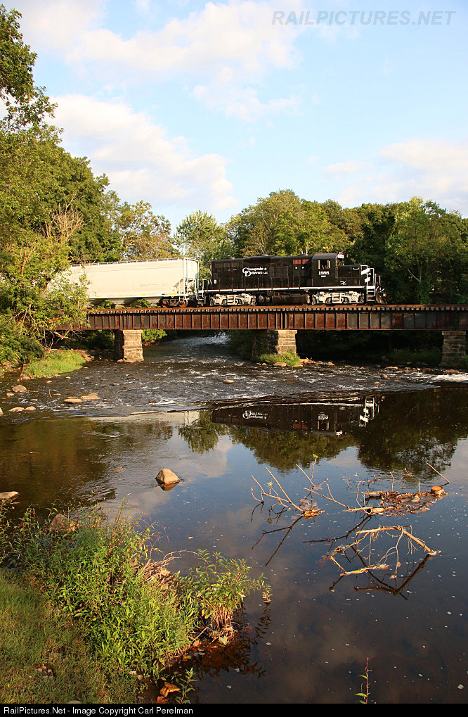 Dover & Rockaway River GP9u 1888 is now lettered for its corporate parent, the Chesapeake & Delaware LLC. The train is on the D&R's Rockaway River bridge, in Rockaway Borough, N.J.