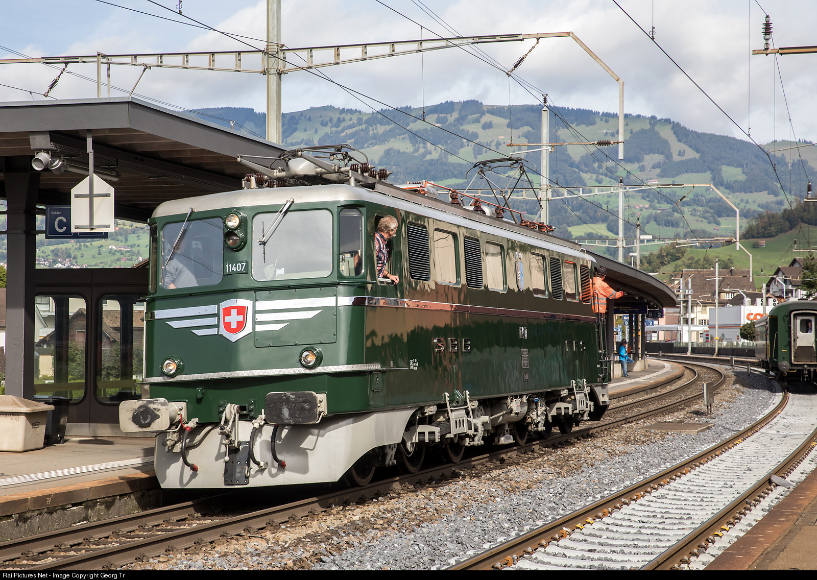 | Gotthard locomotive Ae 6/6 # 11407 "Aargau" of SBB Historic, on long term loan to and operated by association Mikado 1244, is runing around her train at Schwyz. The engineer is leaning out from the cab, to see the signs of the shunting personnel in the other cab. |