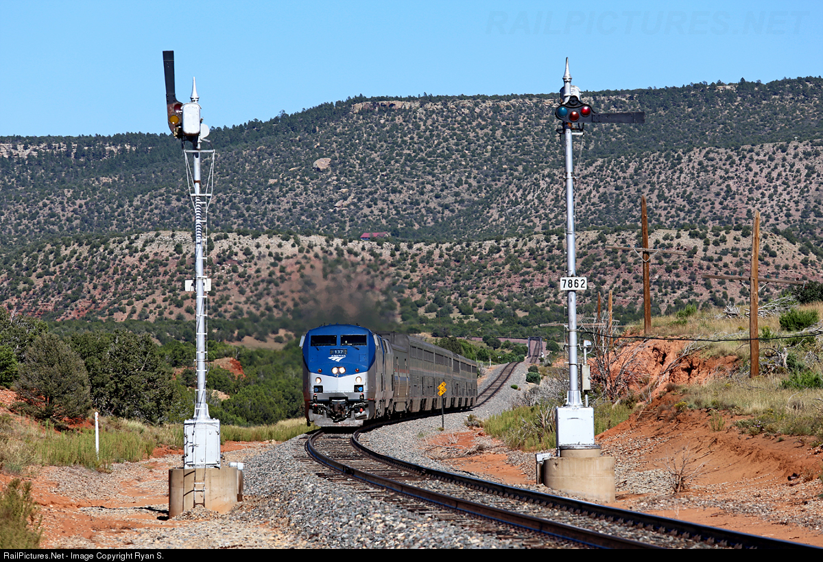 Charging out of the sag which crosses Tecolote Creek in the distance, Amtrak's westbound Chief prepares to take a clear indication displayed by signal 7861, east of Chapelle on the Glorieta Subdivision. This remote stretch of railroad in New Mexico's San Miguel County looks much the same today as it did when the AT&SF first built through the untamed west. The historic signals, joined rail, wood ties, date-nails, and code-line that survive serve as unlikely caretakers of the memory of the Santa Fe and the import role it played in the growth of the Southwest.