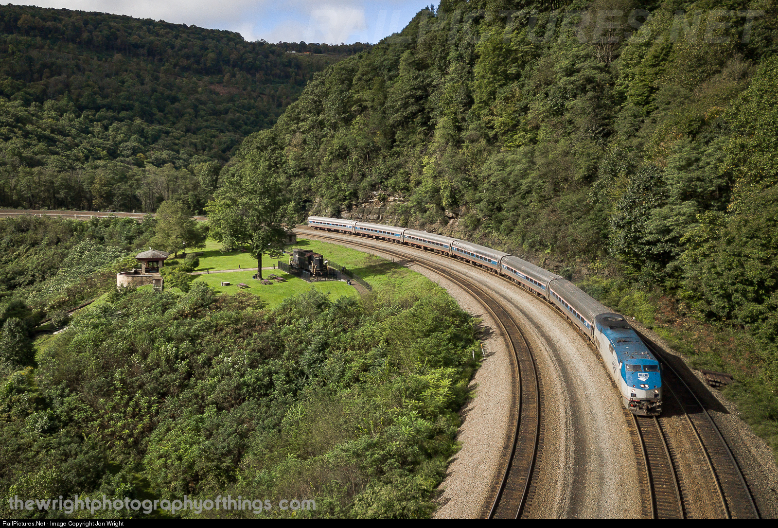 Passengers aboard the Pennsylvanian pass though the apex of Horseshoe Curve.
