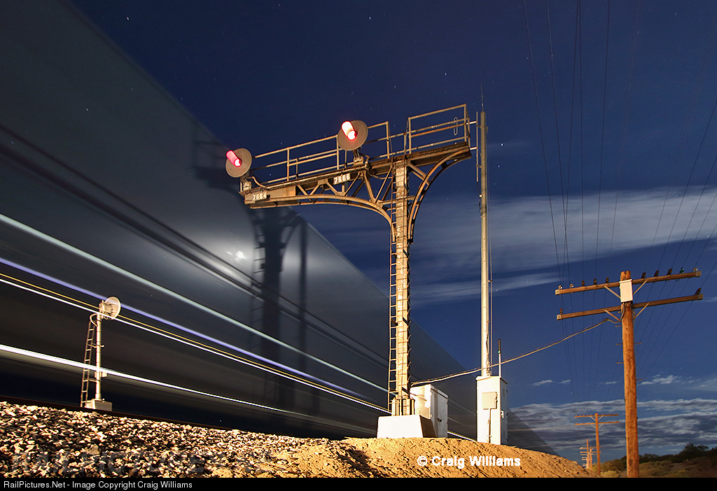 Between Dome and Wellton, there is 16 miles of original SP double track. The 2nd track was built in 1926, with the original main built by the end 1879. While it shows 2 main CTC, the trackage is signaled basically in one direction like traditional ABS. Nice old ex-SP cantilever signals are located around Wellton and Dome back in 2017. An eastbound streaks thru the night as they pass the eastbound approach signal to West Wellton.