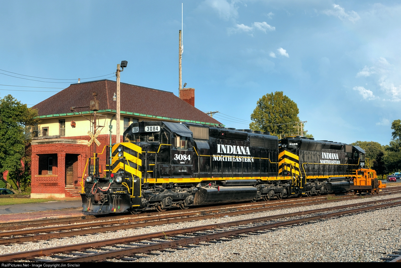 Following a brief (but heavy) fall shower, Indiana Northeastern's only six-axle locomotives drip-dry in the late afternoon sun in front of the railroad's main office, which once served as the New York Central's Lansing Division headquarters one hundred years ago. Unit 3084 was built at GMDD 12/66 as CP 5527 [SD40]. Unit 3125 was built at EMD 9/69 as SP 9006 [SD45]. These two units were repainted last year in the railroad's new shop near Ashley-Hudson, Indiana, and are kept impeccably clean!