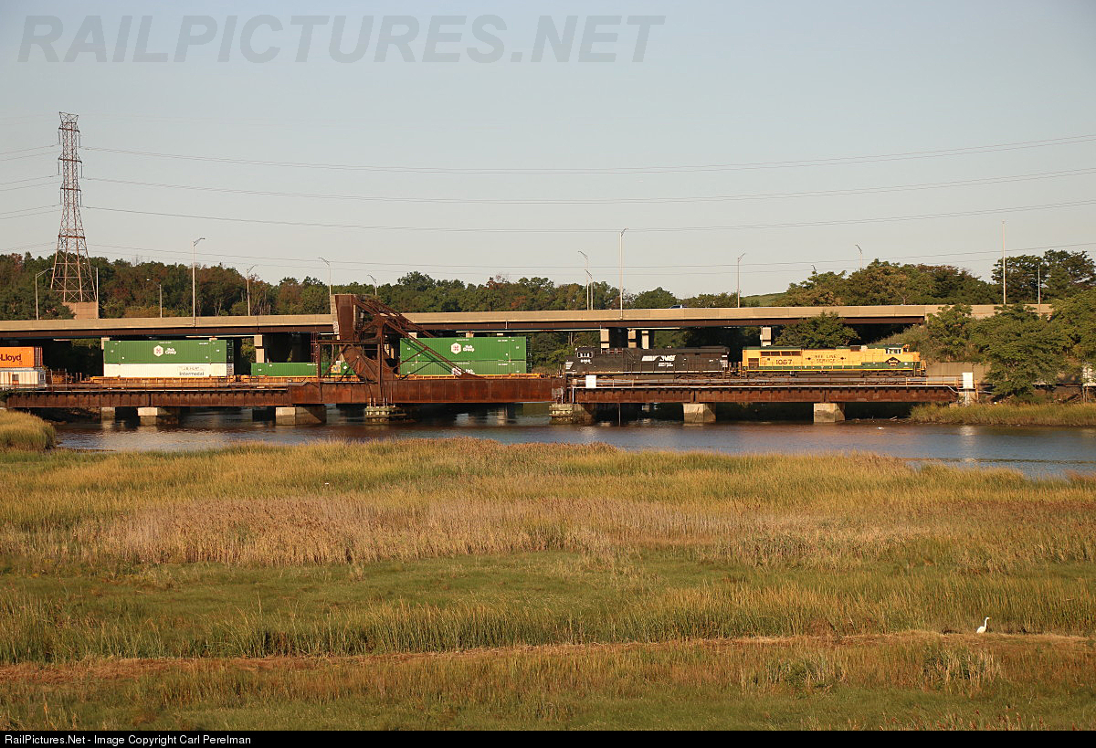 Norfolk Southern intermodal train 20R crosses the Rahway River en route to its terminus at the E-Rail Intermodal Terminal. The train is operating over Conrail's Garden State Secondary.