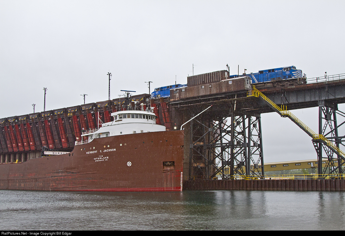| An Lake Superior & Ishpeming dock crew works their ore dock near Marquette, MI while the Herbert C. Jackson ore carrier takes on taconite ore. The ship will leave later that evening. While visiting the area, LS&I was keeping the Eagle Mills-ore dock run under CEFX power. Mine runs ran with pairs of CEFX, U30Cs or C30-7s. |