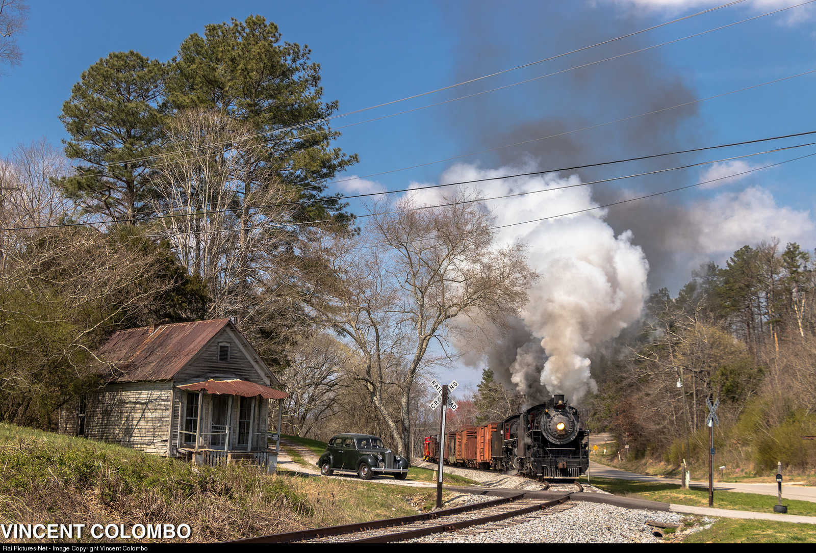 | Southern 630 and 4501 bring a freight through Rock Spring on it's southward journey to Summerville. The antique car and worn-down shack create a great feel of rural Georgia. All part of the Lerro Productions two-day charter on the TVRM. |