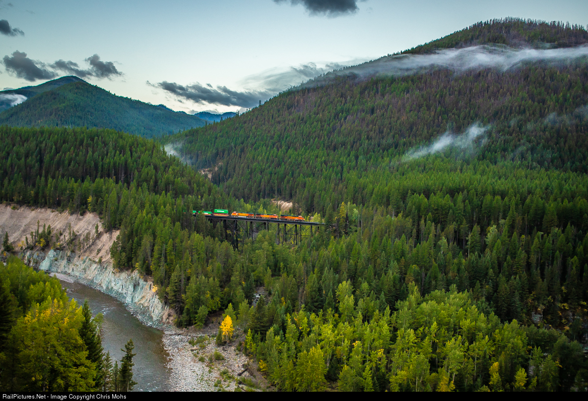 As the sun peeks over the surrounding mountains, an early morning westbound BNSF Stack crosses the Sheep Creek Trestle over Sheep Creek. Just west in this heavily forested landscape is Essex Montana with its yards and the Issac Walton Inn built to house railroad crews in 1939