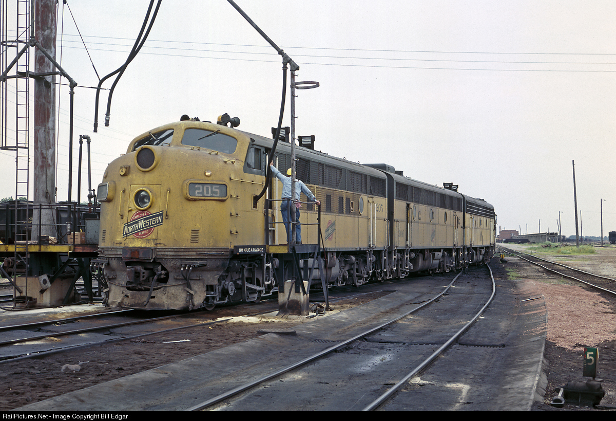 CNW 205, a former Chicago Great Western F3A is mated up with an F3B, F7B and a GP9 at the sanding tower in Oelwein, IA. The consist is being readied for an assignment handling a train of the former CGW main. Within two years, CNW take over the parallel Rock Island Spine Line and through traffic between the Twin Cities, Des Moines, IA and Kansas City will transfer away from old CGW and M&St. L routes. Oelwein will ultimately be sold off and much of the CGW abandoned.