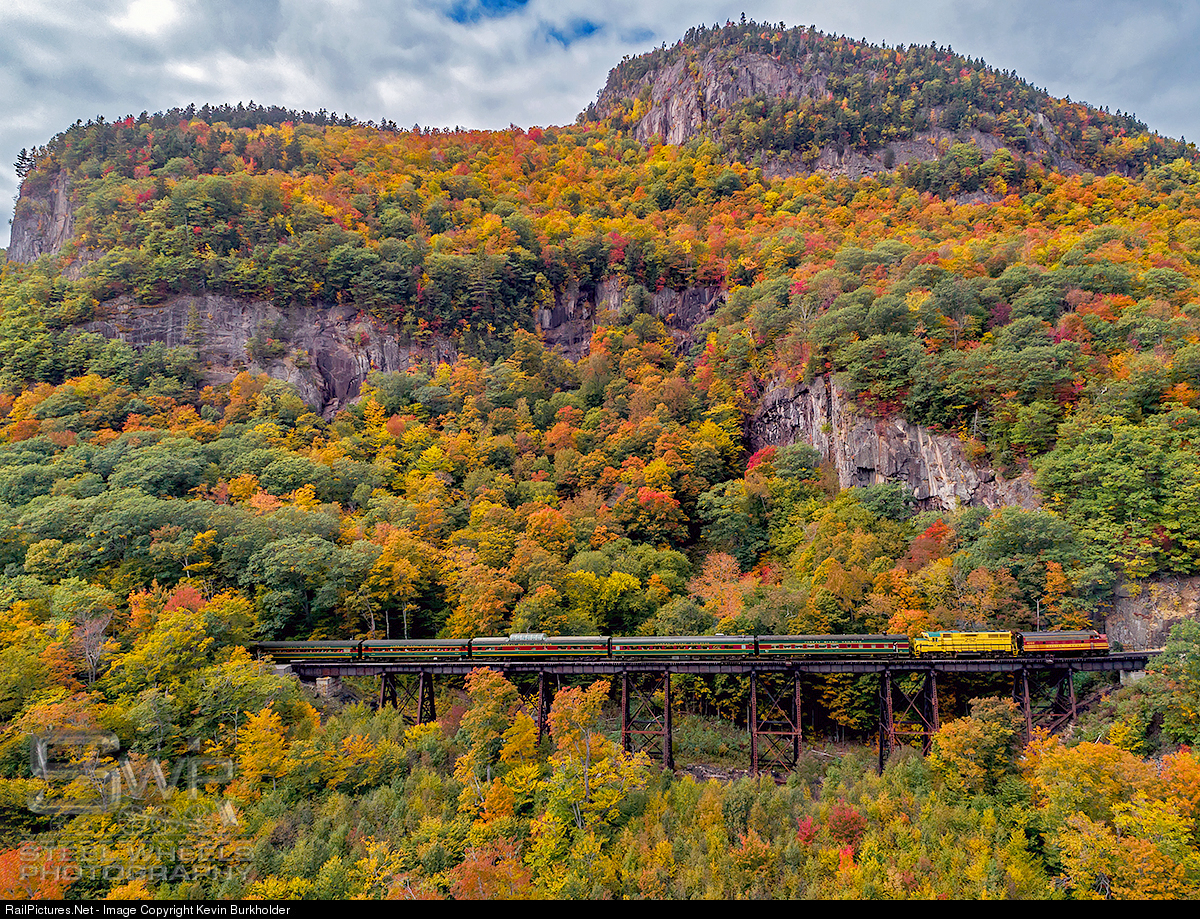 Foliage is at or near peak this weekend in the White Mountains as the Conway Scenic Railroad Notch train heads west over the Frankenstein Trestle in Hart's Location, New Hampshire, with Boston & Maine F7A 4266 leading CSRX (Maine Central scheme) GP38 252.