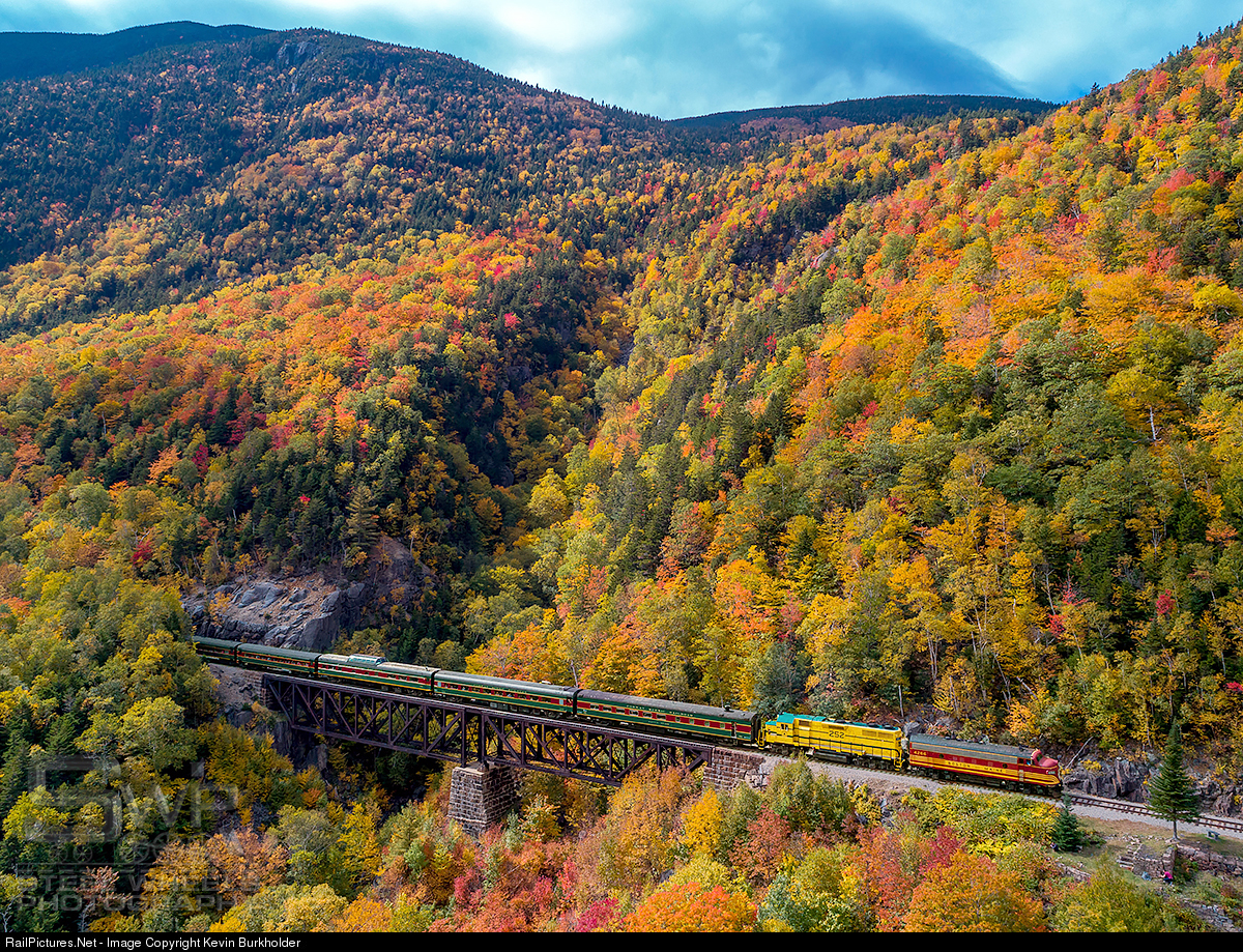 | Foliage is at or near peak this weekend in the White Mountains as the Conway Scenic Railroad Notch train heads west over the Willey Brook Bridge in Hart's Location, New Hampshire, with Boston & Maine F7A 4266 leading CSRX (Maine Central scheme) GP38 252. |
