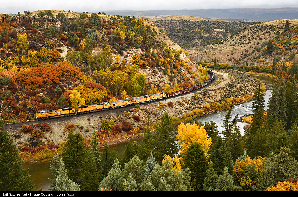 Fall color is peaking west of the Continental Divide as Denver North Yard to Salt Lake City Roper Yard freight MNYRO rounds the curve at Burns as it heads west for Grand Junction.