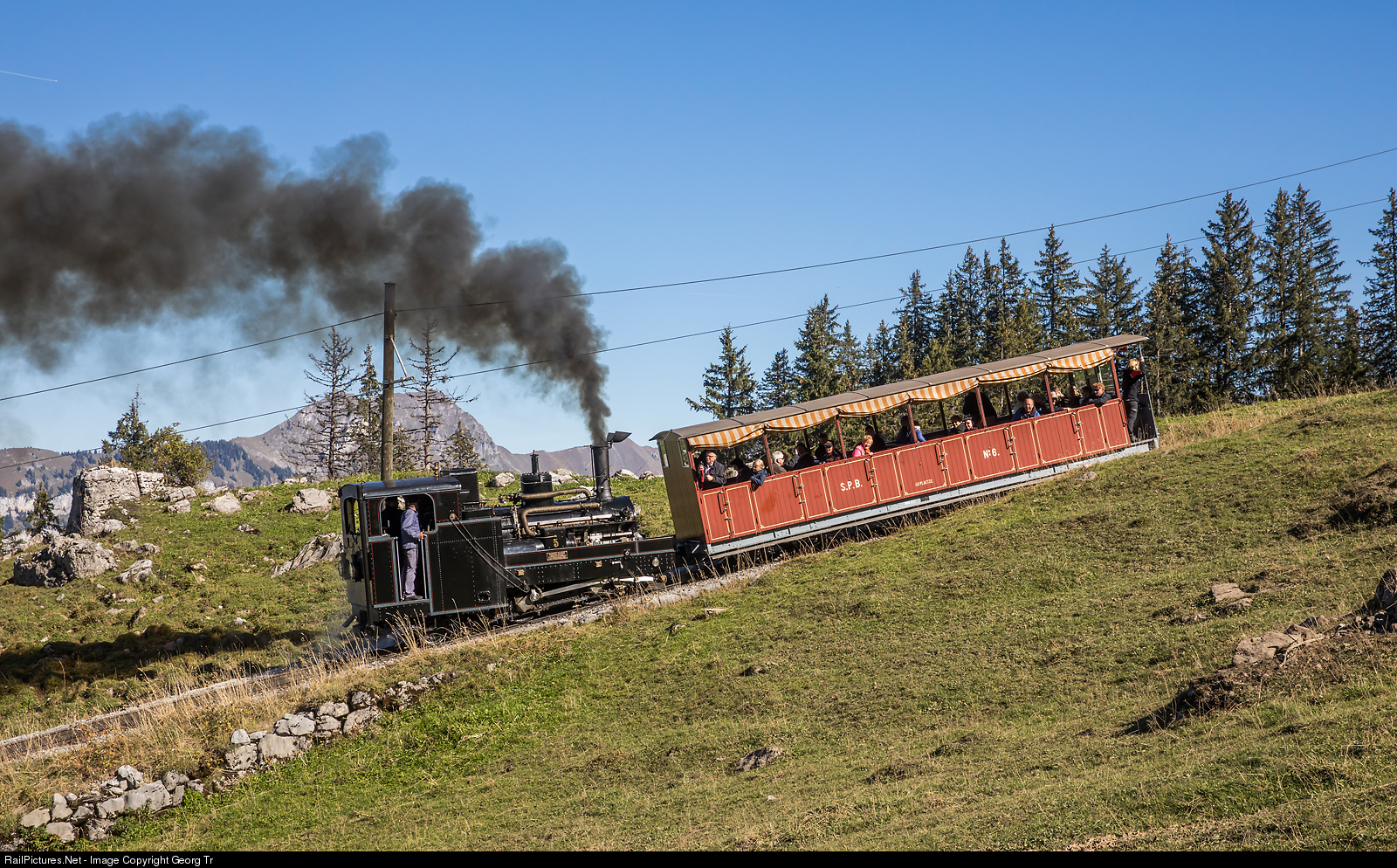 Cogwheel steamlocomotive H 2/3 # 5 of the Schynige Platte Bahn (SPB) is shoving open summer car # 6 up the mountain above Breitlauenen crossing station. Locomotive and car date from 1894. The SPB was opened in 1893 and celebrate 125 years of opertaion this year.