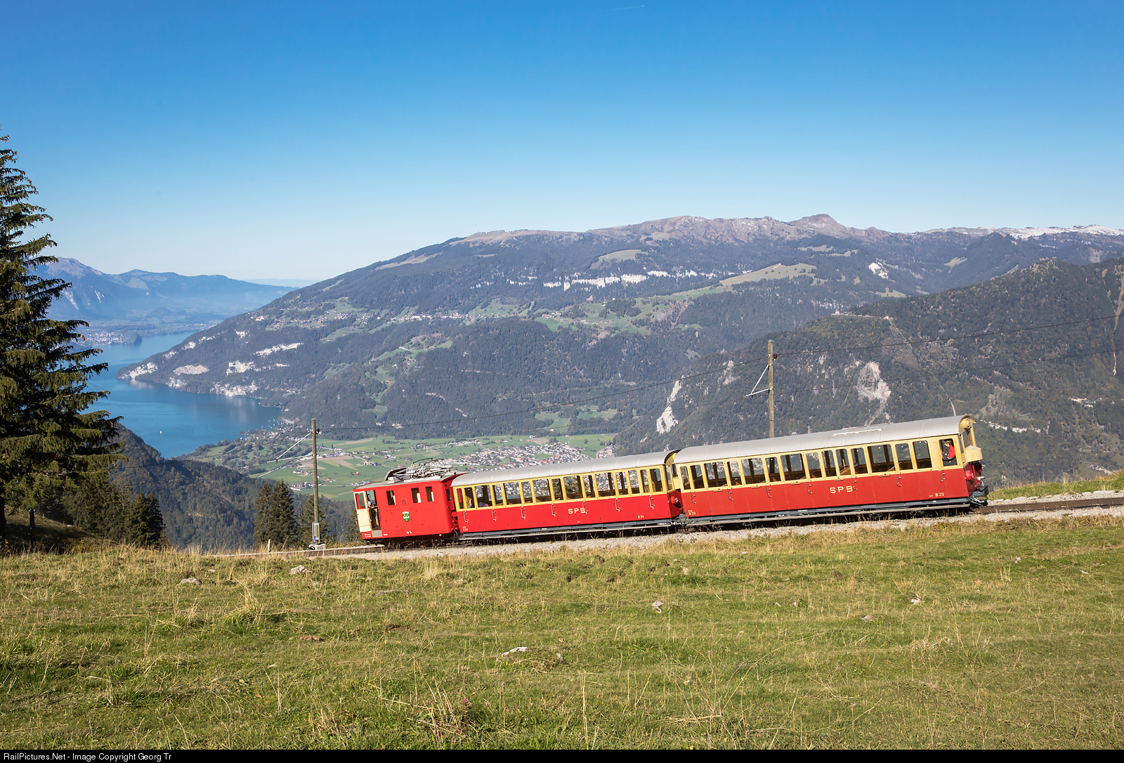 Cogwheel train of the Schynige Platte Bahn going down the mountain above Breitlauenen, with Lake Thun in the valley. Locomotive He 2/2 # 13 "Matten", built in 1914 by SLM and BBC, vintage cars B # 24 from 1901 (rebuilt 1968) and B # 23 from 1898 (rebuilt 1968). The locomotives of the SPB have the pantograph lowered when going downgrade, to reduce wear on the contact strip and catenary wire.