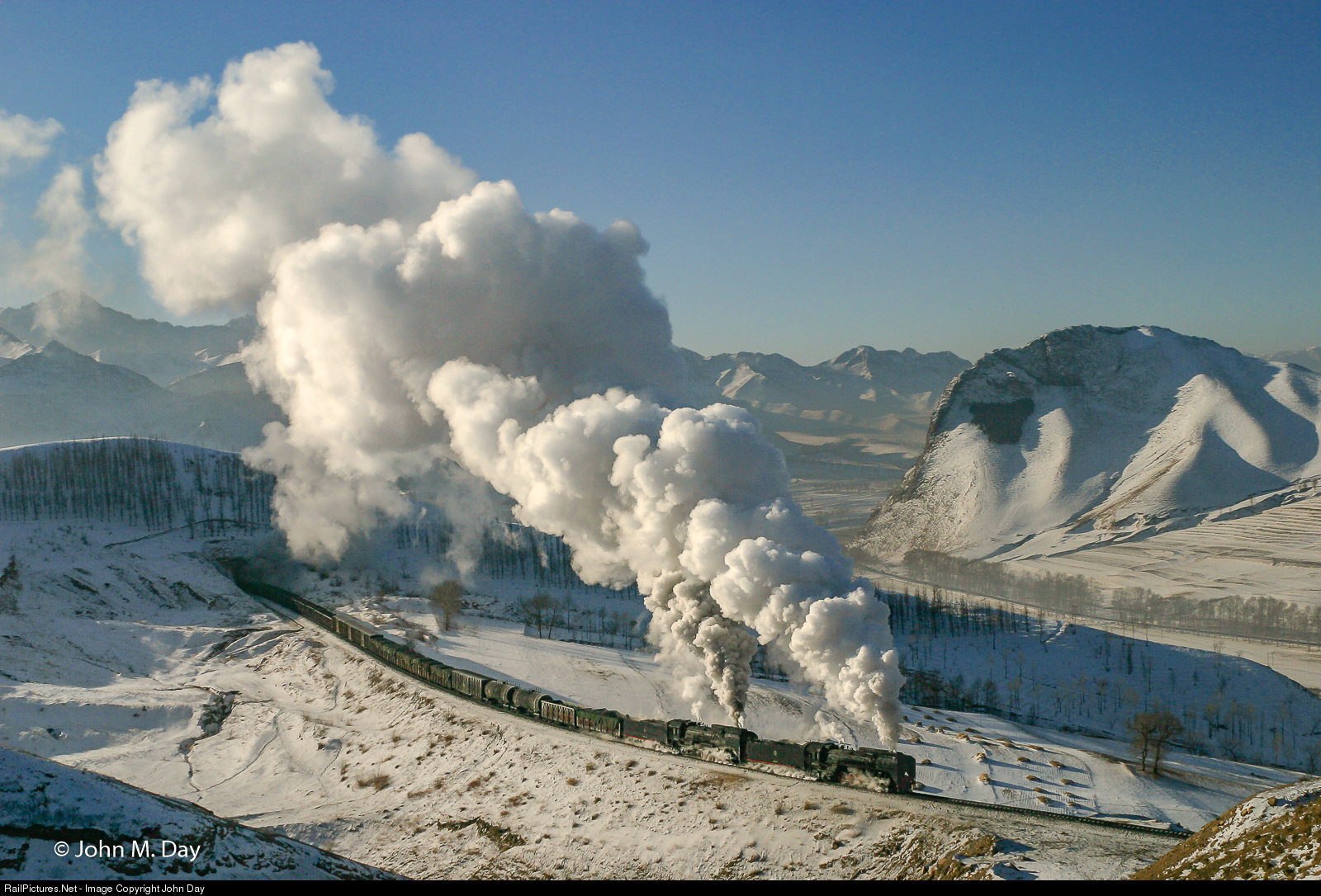 Fifteen years ago, you didn't have to wait very long for a double headed steam train to appear somewhere in the area of Jingpeng Pass. That was a good thing, as even on a sunny day winter temperatures are well below freezing, posing challenges to photographers and their equipment. Here a 2300 tonne maximum load creeps uphill towards the summit, with Mt Hadashan forming a backdrop to the action.
