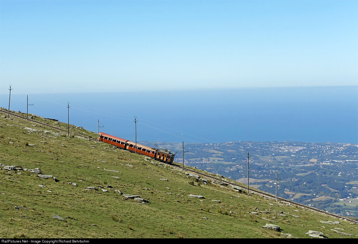 The La Rhune cogwheel railway (rack system Strub) has a length of 4.2 km (2.6 mi), the maximum gradient is 250 ‰, a speed of 9 km/h (5.6 mph) and the electricity supply is 3000 V, 50 Hz, three-phase. From the top of the mountain La Rhune there is a nice view on the cantabrian sea and the coast.