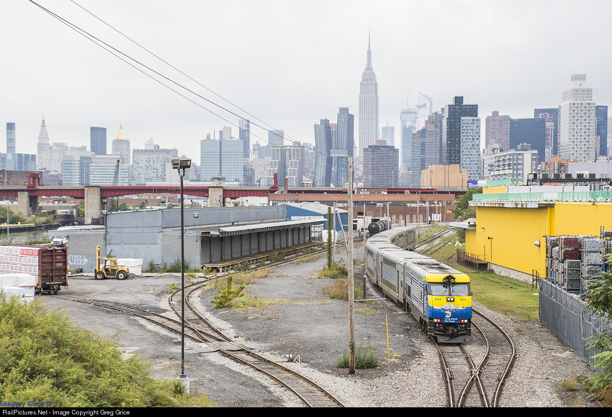 Long Island Rail Road DM30AC 404 shoves Extra 5007 west through New York & Atlantic Railway's Wheelspur Facility on their detour to Long Island City Yard. This rare detour was a result of a minor derailment at Borden Avenue on the Main Line. In order to get trainsets to LIC Yard for the evening rush hour, 4 equipment extras were run down the Lower Montauk. |
