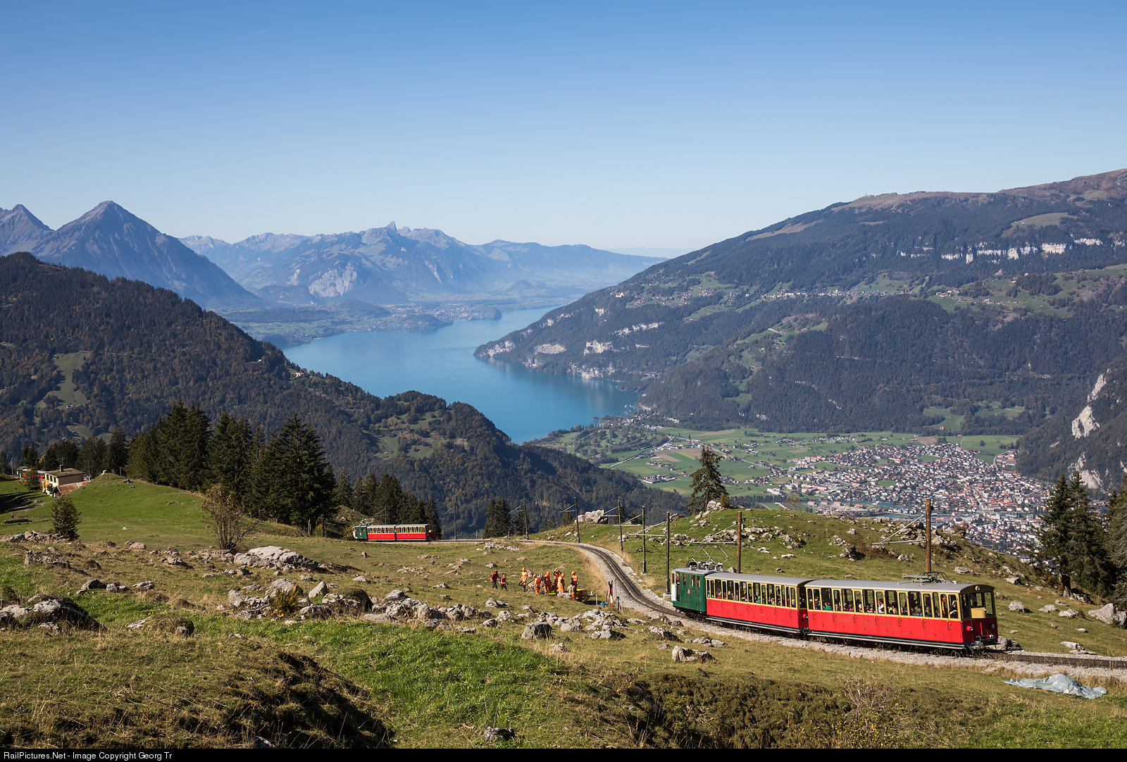 Dense operation at the Schynigen Platte on this splendid autumn day. 3 cogwheel trains follow each other on sight distance of about 1 minute, the first two can be seen here. The third is still at Breitlauenen crossing station, which is visible on the left, and there is also a train going downhill. In the middle of the picture you can see track worker apprentices, who acquire their first knowledge during a leisurely operation. The first train is pushed by He 2/2 # 12 from 1914, the second by He 2/2 # 61 from 1912 (built for the Wengernalpbahn). In the background Lake Thun, and the Niesen and Stockhorn mountains.