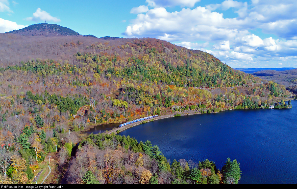 The Orford Express skirts the rugged shores of Lake Orford beneath the mountain bearing the same name(Mt Orford). Consist includes FL9 #484, RDC-1 #6121, Dome-Diner Lounge #310, RDC-1 # 6125 and MLW M420TR #26.